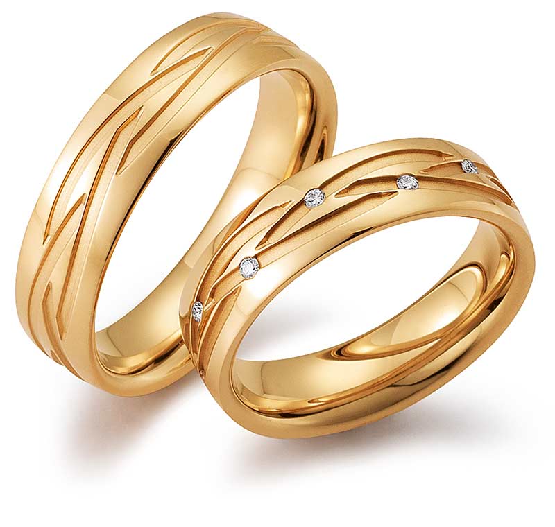 Trauringe in 585 Gelbgold seidenmatt und poliert. 12 Brillanten zusammen 0,12 ct. TW/SI. Breite 6,00 mm.