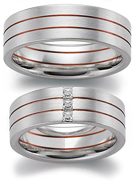 Edle Trauringe in 950 Platin / 750 Rotgold seidenmatt. 3 Princess - Diamanten zusammen 0,15 ct. TW/VVSI. Breite 7,00 mm.