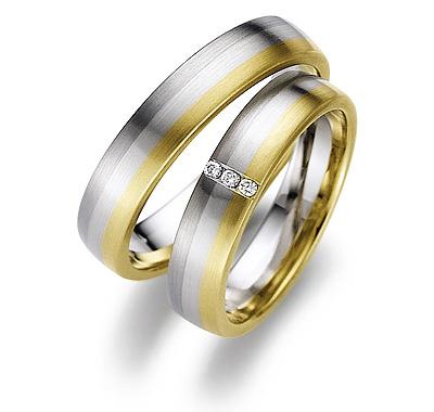 Edle Trauringe in 950 Platin - 750 Graugold - 750 Gelbgold seidenmatt. 3 Brillanten zusammen 0,03 ct. TW/VSI. Breite 4,50 mm.