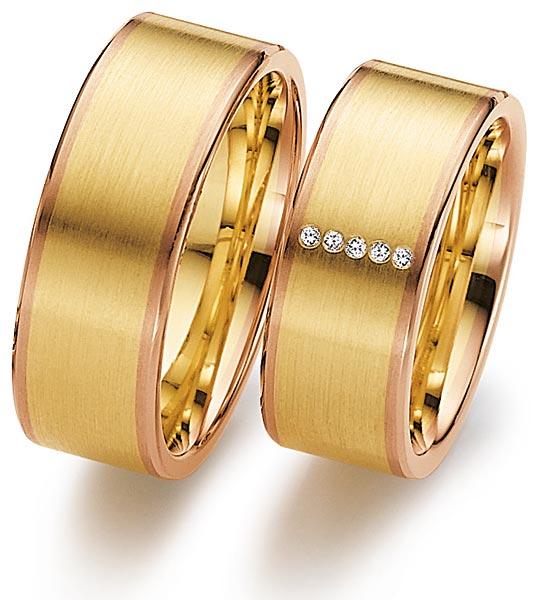 Feine Trauringe in 585 Gelb-Rotgold seidenmatt. 5 Brillanten 0,025 ct. TW/SI. Breite 8,00 mm.