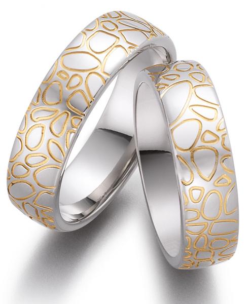Trauringe in 585 Weissgold - Gelbgold seidenmatt mit Muster. Breite 6,00 mm.