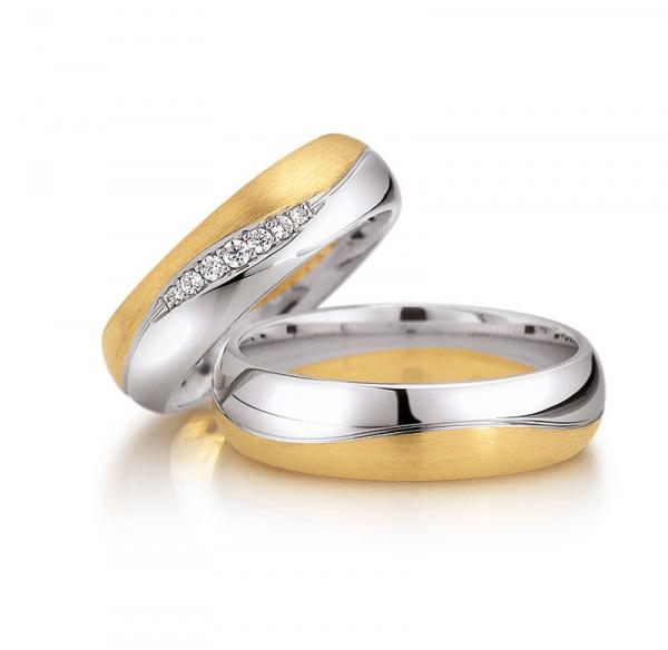 Trauringe in 585 Weissgold poliert - Gelbgold seidenmatt. 7 Brillanten zusammen 0,08 ct. TW/SI. Breite 7,00 mm.
