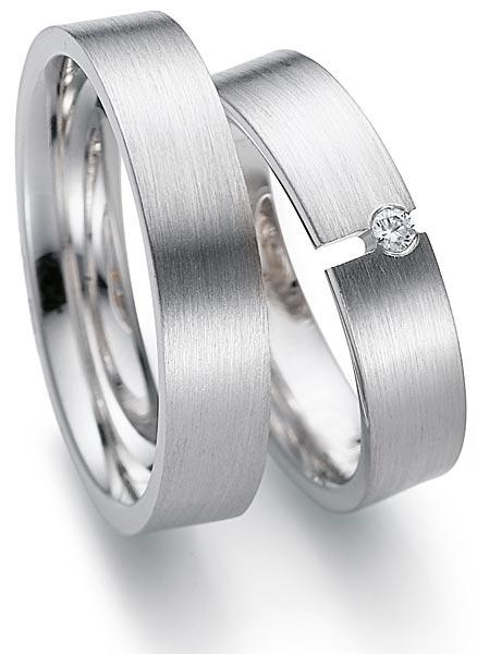 Edle Trauringe in 585 Weissgold seidenmatt. 1 Brillant 0,03 ct. TW/SI. Breite 5,00 mm.