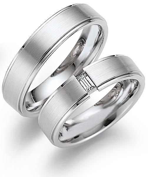 Edle Trauringe in 585 Weissgold seidenmatt und poliert. 1 Baguette - Diamant 0,12 ct TW/VVSI. Breite 5,50 mm.