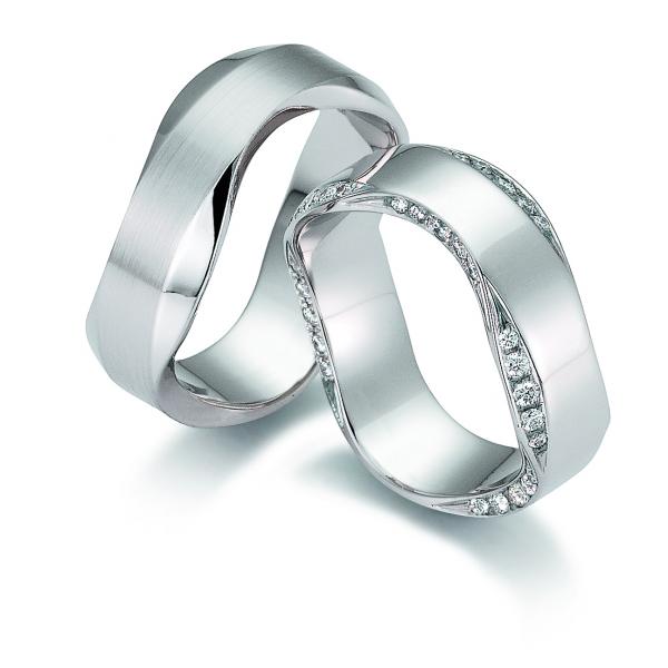 Trauringe in 585 Weissgold seidenmatt und poliert. 60 Brillanten zusammen 0,486 ct. TW/SI. Breite 6,00 mm.