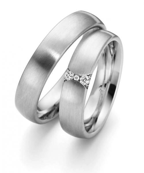 Trauringe in 375 Weissgold seidenmatt. 5 Brillanten zusammen 0,055 ct. TW/SI. Breite 5,00 mm.