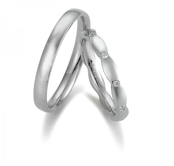 Klassische, schlichte Ringe mit Brillantbesatz aus dem Hause Gerstner. Trauringmanufaktur seit 1862 - Pforzheim. 585er Weißgold mit 10 Brillanten 0,05 ct TW-SI. Ringbreite 3,00mm.