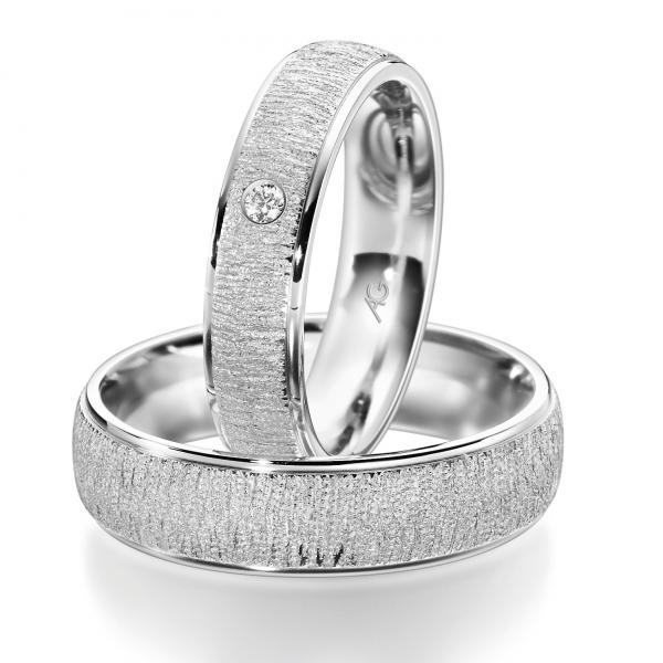 Gehämmert in der Oberfläche. Starke Struktur. 375er Weißgold mit 1 Brillant zusammen 0,03ct TW-SI. Breite Damenring 5,00 mm. Herrenring 6,00 mm. Ringe sind von August Gerstner - Made in Germany - since 1862.