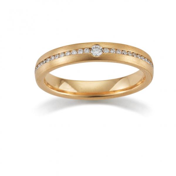 Brillantring von August Gerstner. Ideal als klassischer Verlobungsring bzw. Antragsring geeignet. Schlicht und elegant. 585er Rosegold mit 29 Brillanten zusammen 0,18 ct TW-SI. Breite 3,50 mm.