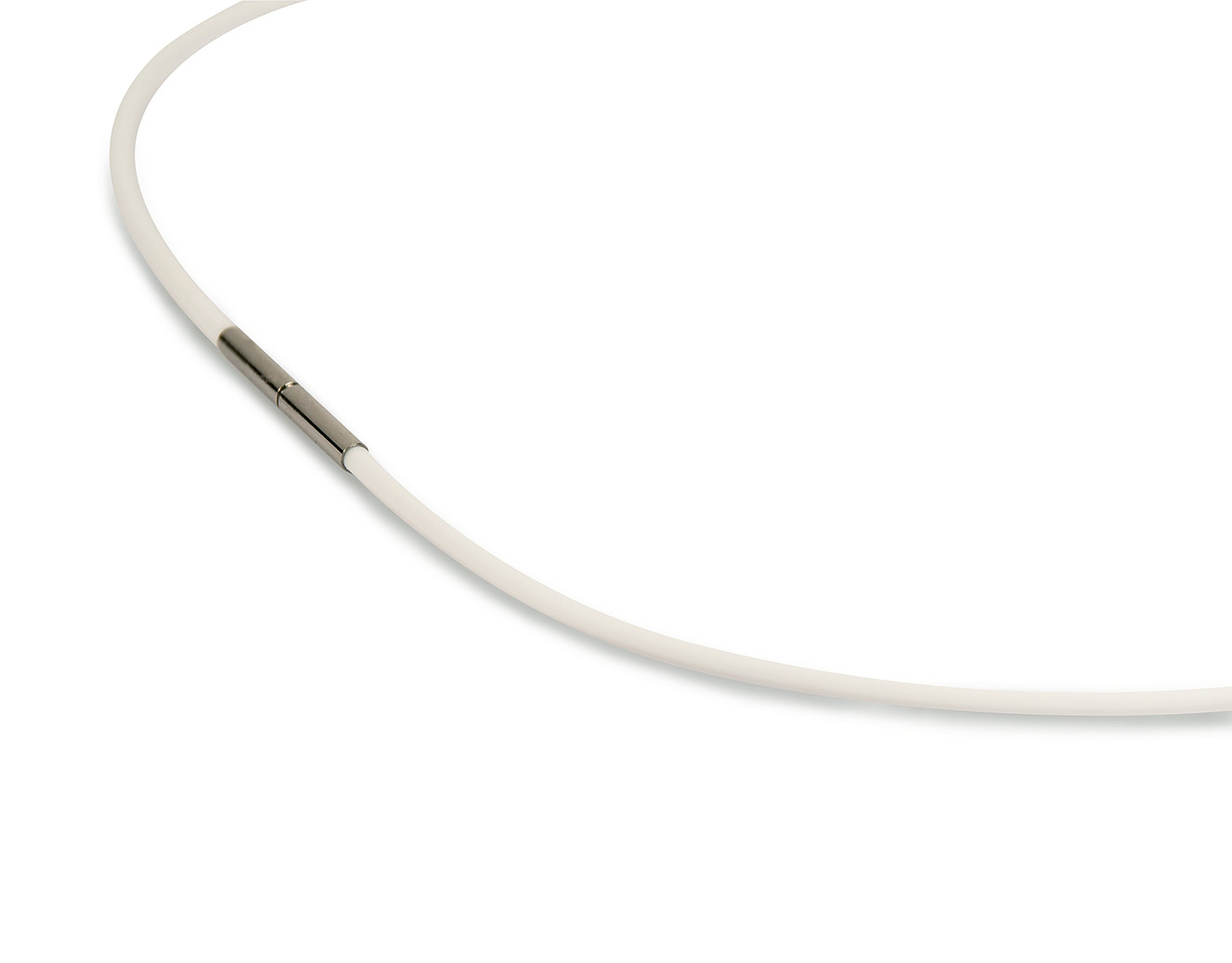 Collier mit weissem Kautschuk und Titan Bajonette Verschluss . Kautschuk Ø 2,0 mm Bajonette Verschluss Ø 2,7 mm In den Längen 42 , 45 und 50cm .
