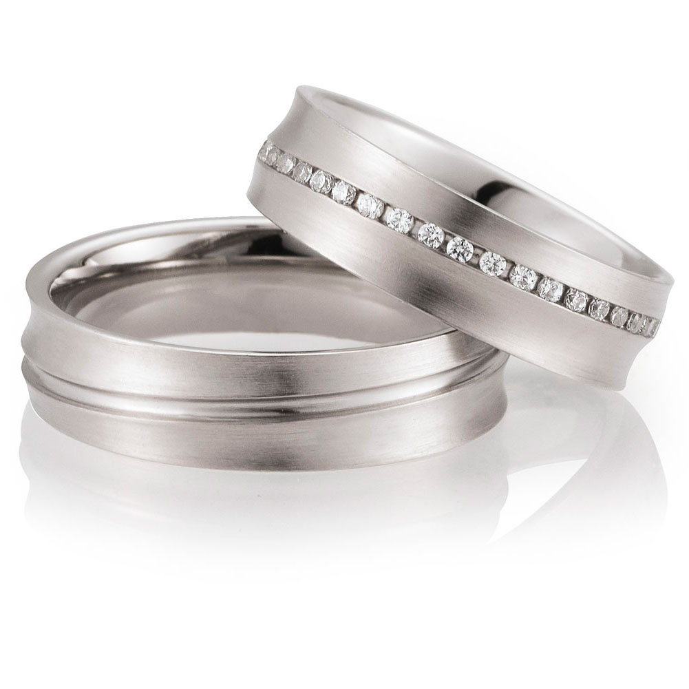 Wertvolle Eheringe der Marke Breuning, Serie PALLADIUM II. Memoire Eheringe aus 500 Palladium seidenmatt und poliert. Mehrere Brillanten zusammen 0,40 ct. W/SI. Breite 6,00 mm.
