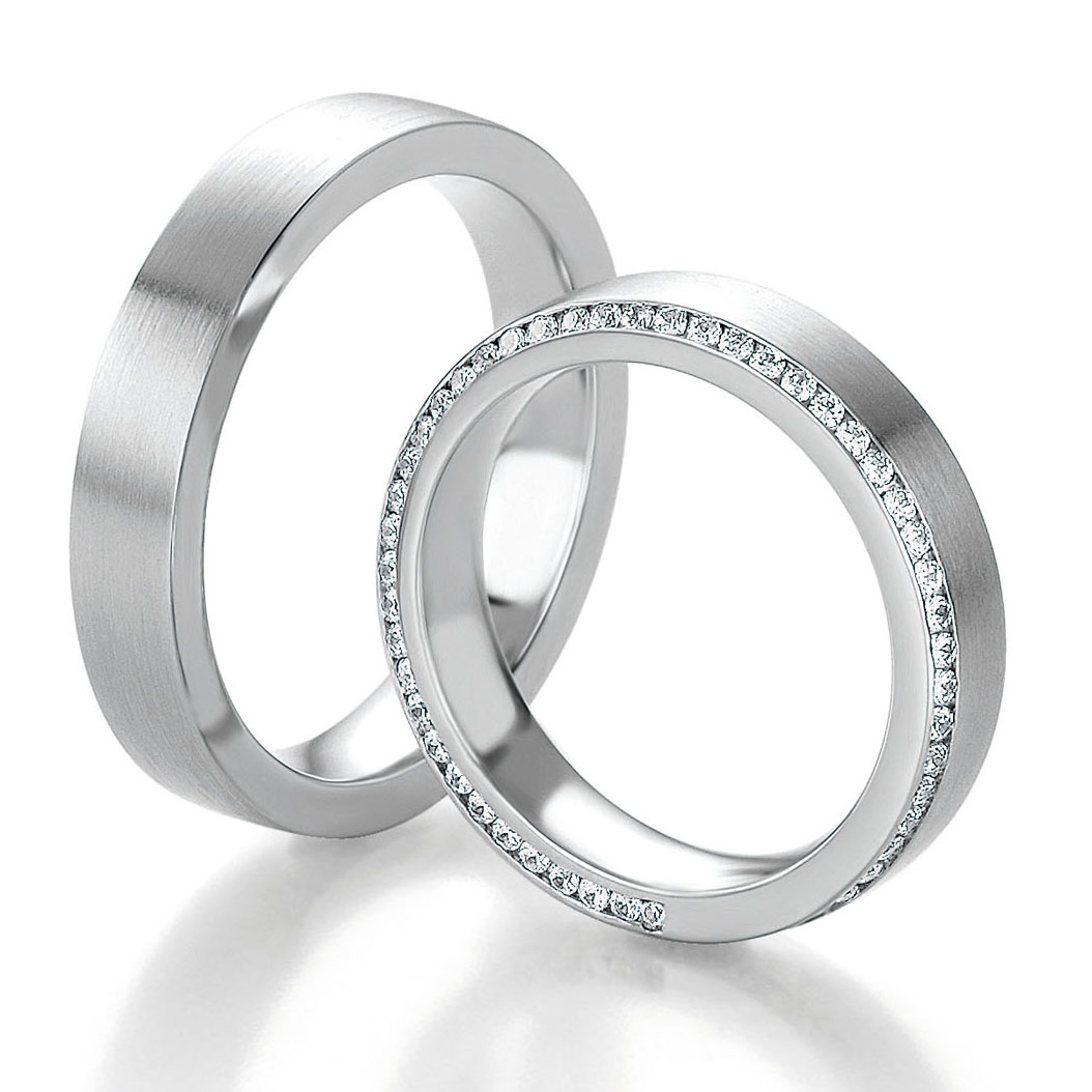 EKLUSIVE Memoire Trauringe der Marke Breuning, Serie DESIGN. Wundervolle Eheringe in 585 Weissgold seidenmatt und poliert. Mehrere Brillanten zusammen 0,398 ct. W/SI. Breite 4,5 mm.