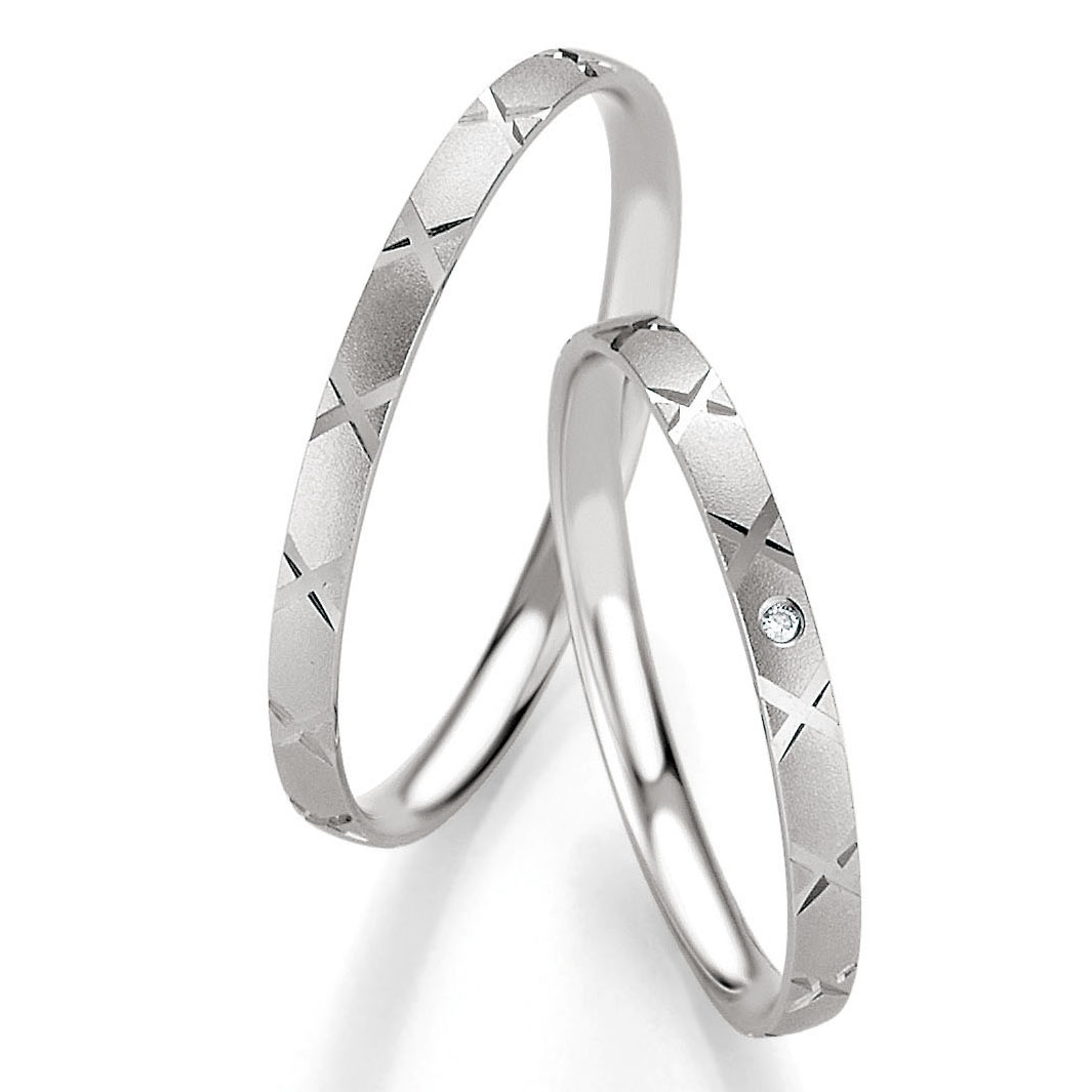 Trauringe der Marke Breuning, Serie BASIC SLIM. Herrliche klassische Eheringe in 333 Weissgold seidenmatt struktiert. 1 Brillant 0,007 ct. W/SI. Breite 2 mm.