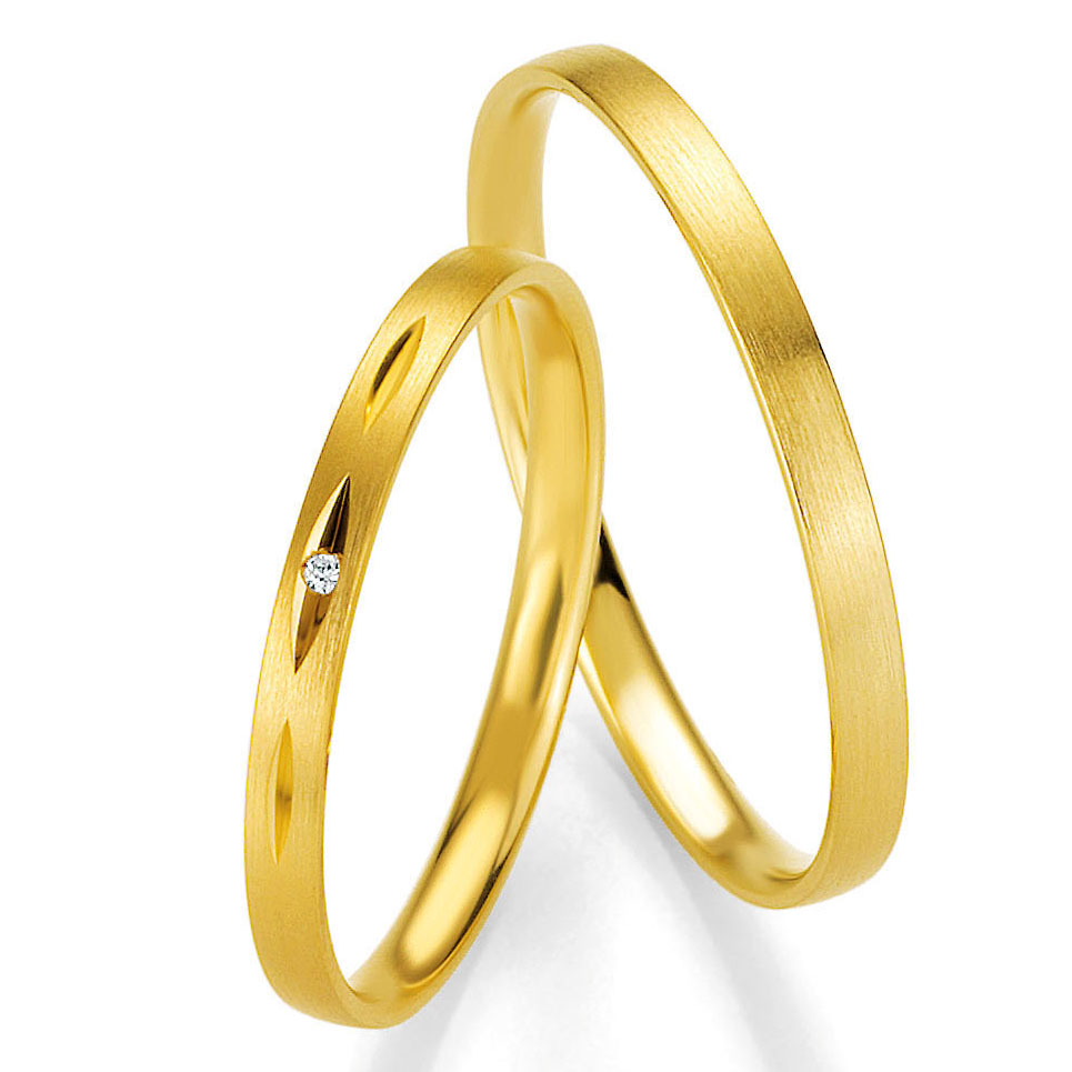 Trauringe der Marke Breuning, Serie BASIC SLIM. Herrliche klassische Eheringe in 333 Gelbgold seidenmatt. 1 Brillant 0,007 ct. W/SI. Breite 2 mm.
