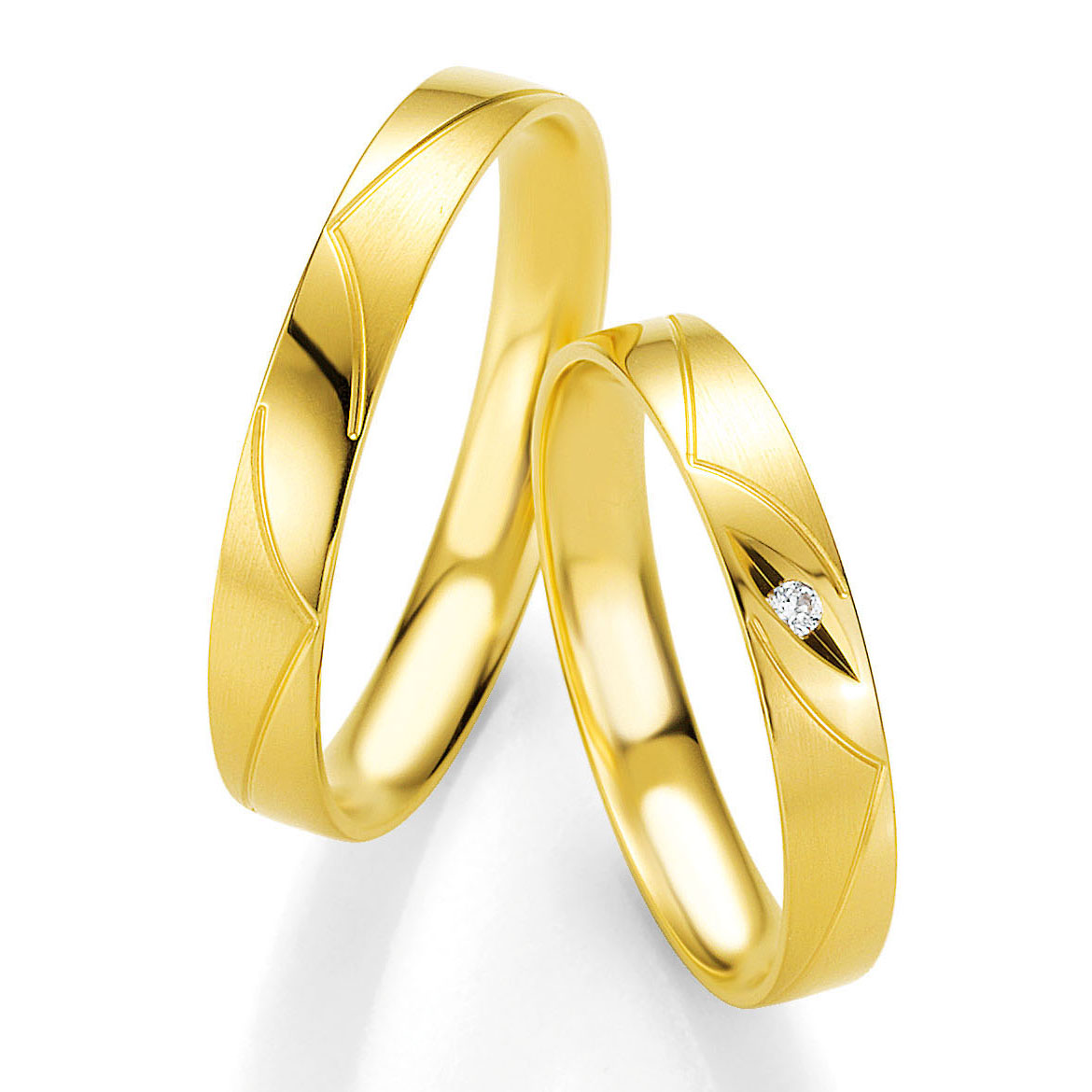 Trauringe der Marke Breuning, Serie BASIC LIGHT 2. Herrliche klassische Eheringe in 333 Gelbgold seidenmatt und poliert. 1 Brillant 0,02 ct. W/SI. Breite 3,5 mm.