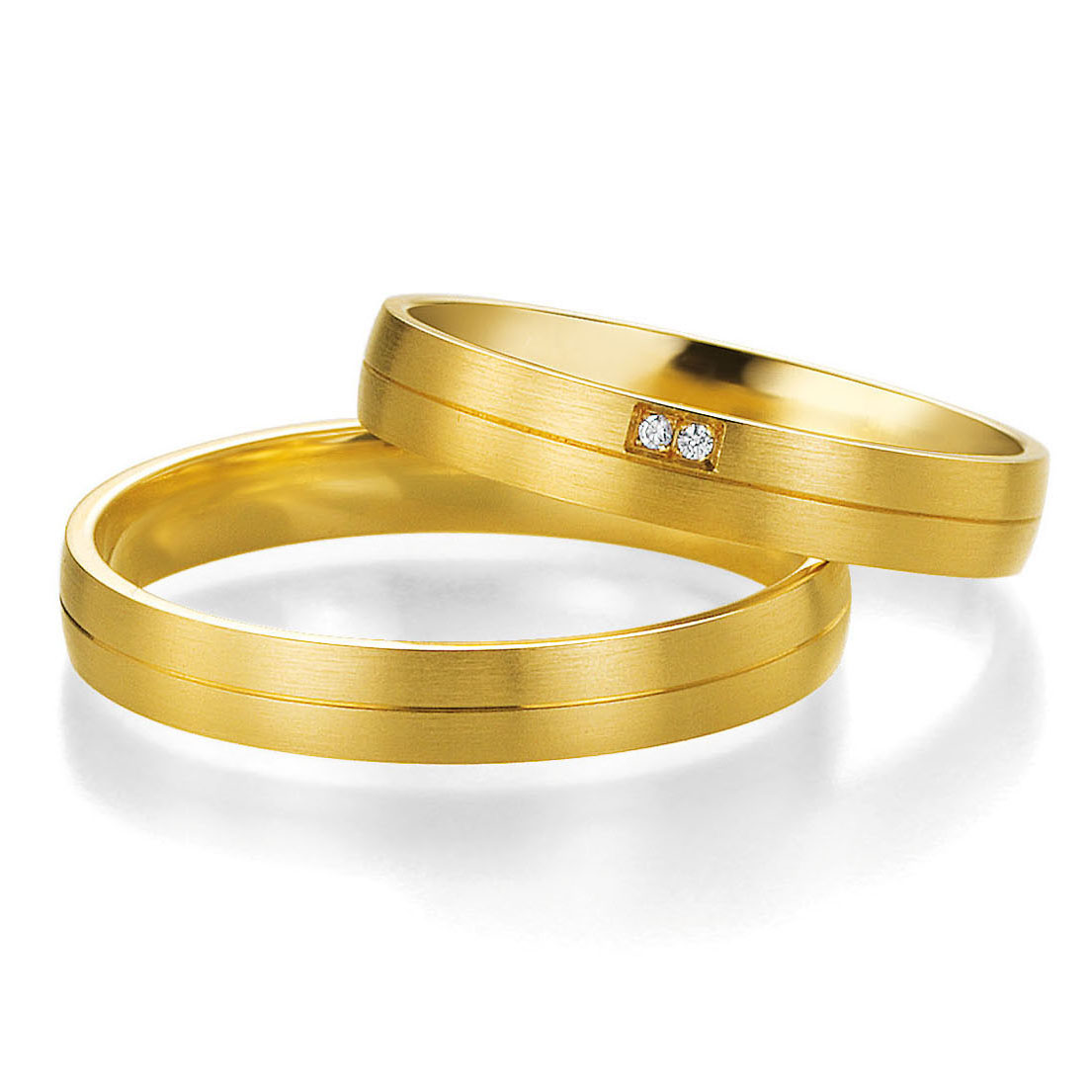 Trauringe der Marke Breuning, Serie BASIC LIGHT. Klassische Eheringe in 333 Gelbgold seidenmatt mit Fuge. 2 Brillanten zusammen 0,011 ct. W/SI. Breite 3,50 mm.