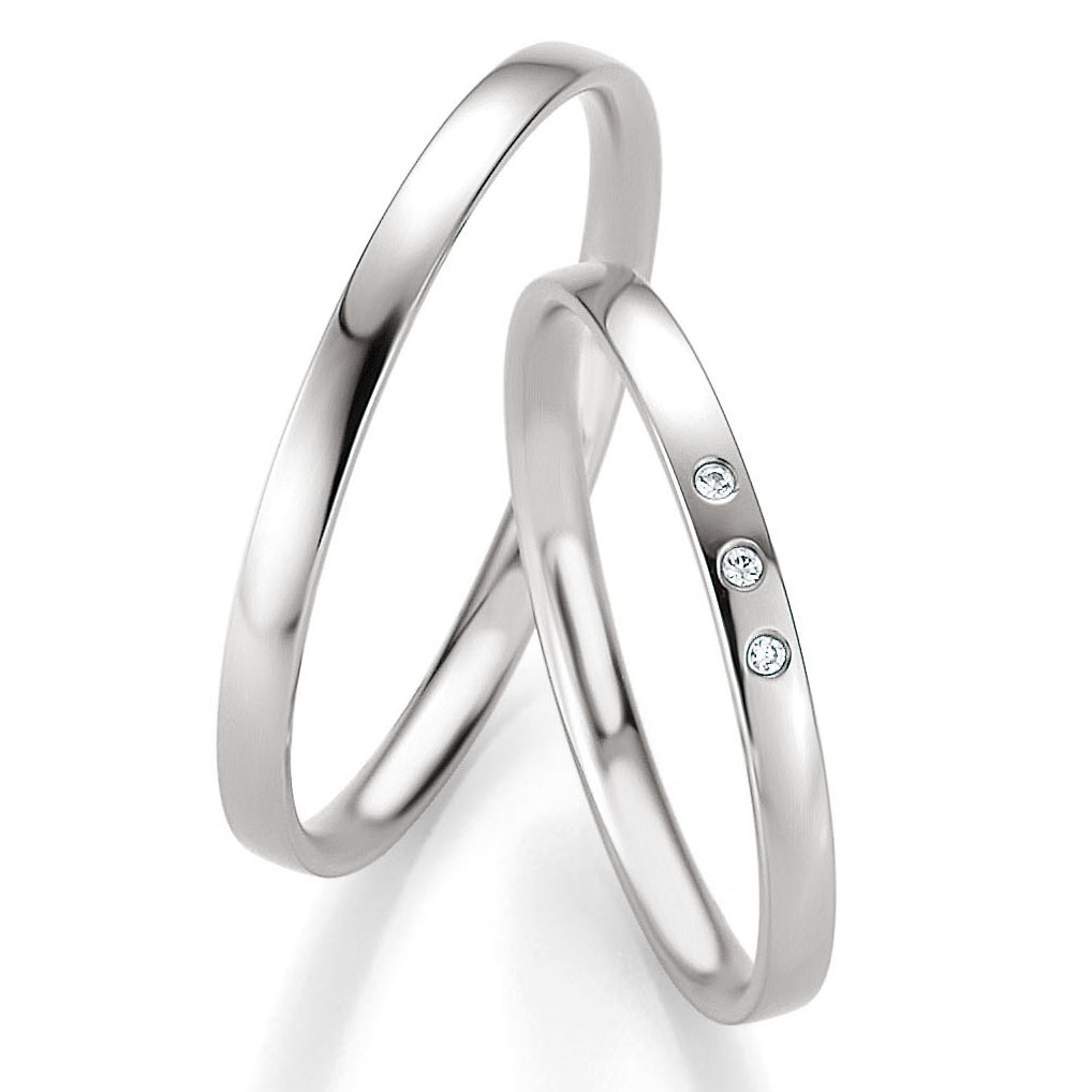 Trauringe der Marke Breuning, Serie BASIC SLIM. Herrliche klassische Eheringe in 333 Weissgold poliert. 1 Brillant 0,006 ct. W/SI. Breite 2 mm.