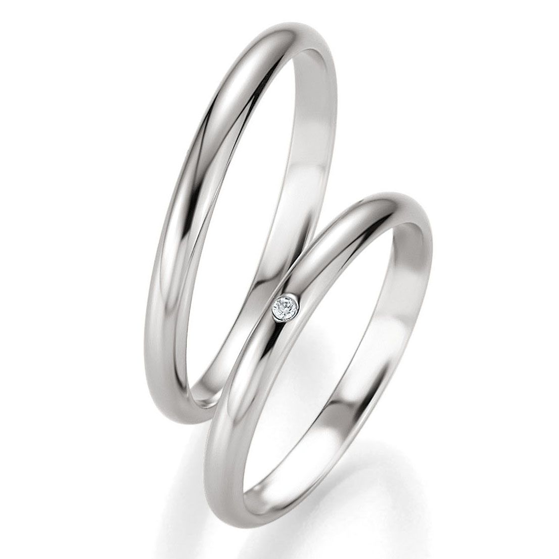 Trauringe der Marke Breuning, Serie BASIC SLIM. Herrliche klassische Eheringe in 333 Weissgold poliert. 1 Brillant 0,01 ct. W/SI. Breite 2,5 mm.