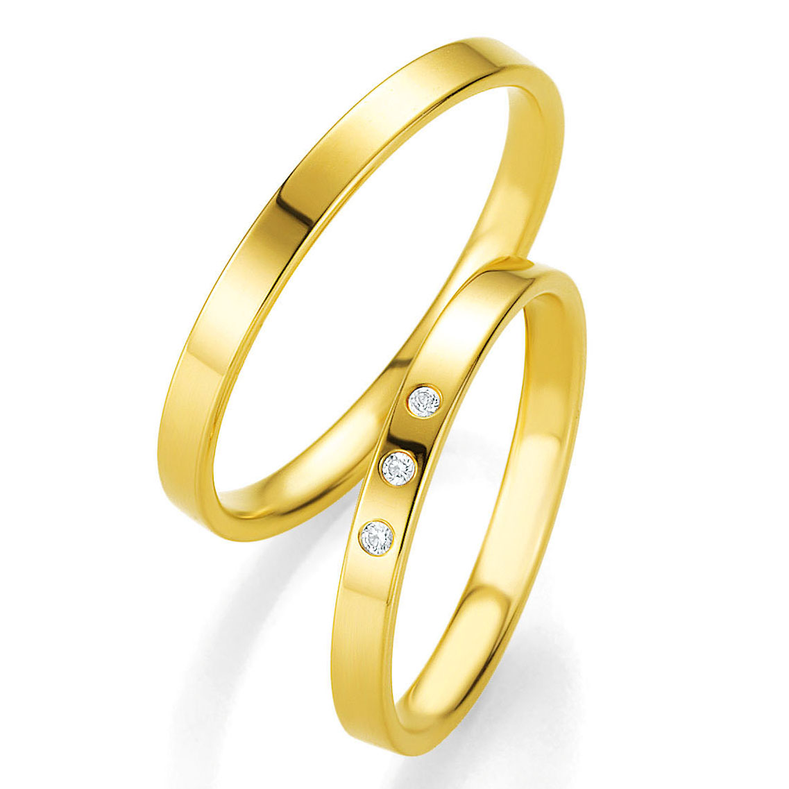 Trauringe der Marke Breuning, Serie BASIC SLIM. Herrliche klassische leicht konkave Eheringe in 333 Gelbgold poliert. 3 Brillanten 0,03 ct. W/SI. Breite 2,5 mm.