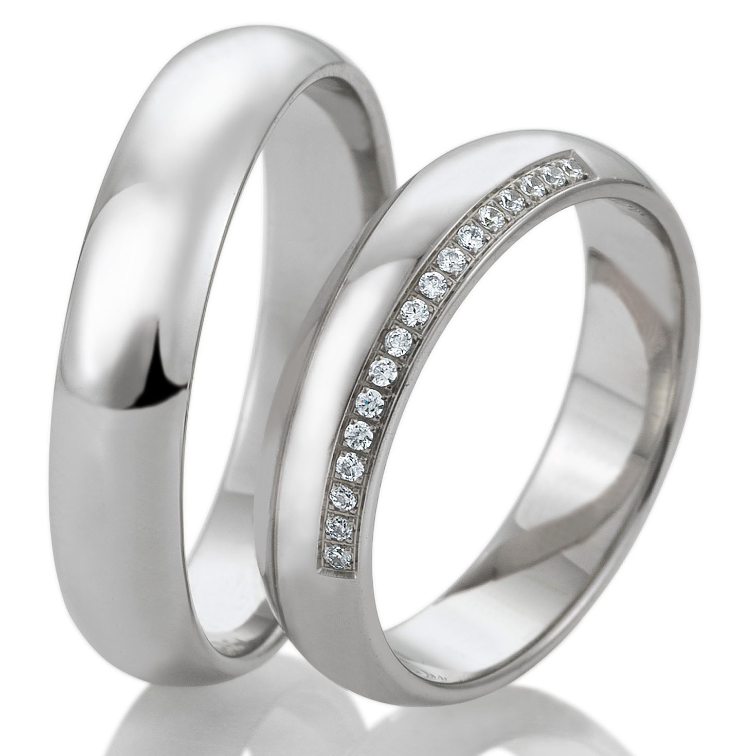 Wertvolle Eheringe der Marke Breuning, Serie PALLADIUM II. Eheringe aus 500 Palladium poliert. Mehrere Brillanten zusammen 0,094 ct. W/SI. Breite 5,00 mm.