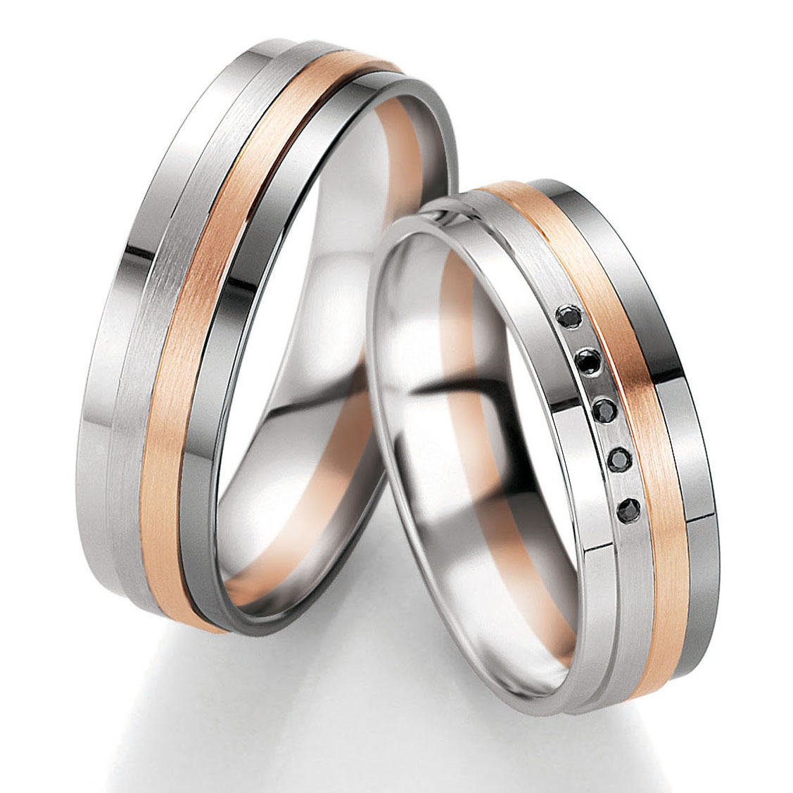 Trauringe der Marke Breuning, Serie B&W Black Diamonds. Traumhafte Trauringe in 585 Weissgold-Graugold-Rotgold seidenmatt und poliert. 5 schwarze Brillanten 0,028 ct. W/SI. Breite 6,0 mm.