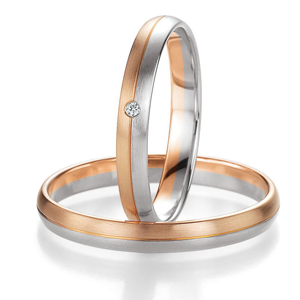 Konkave Trauringe der Marke Breuning, Serie BASIC LIGHT 1. Herrliche Eheringe in 333 Rotgold-Weissgold seidenmatt. 1 Brillant 0,01 ct. W/SI. Breite 3,00 mm. Stärke 1,3 mm.