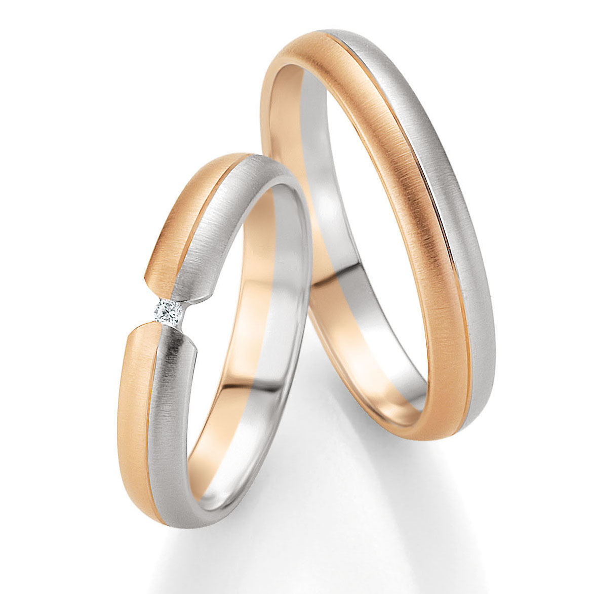 Trauringe der Marke Breuning, Serie BASIC LIGHT 2. Herrliche klassische Eheringe in 333 Rotgold-Weissgold quermatt. 1 Brillant 0,02 ct. W/SI. Breite 4 mm.
