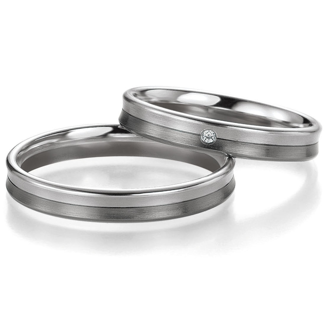 Edle Eheringe aus der Marke BREUNING, Serie Basic Light 1. Ringe aus 585 Weissgold-Graugold seidenmatt und poliert. 1 Brillant 0,01 ct. W/SI. Breite 3,5 mm. Stärke 1,6 mm.