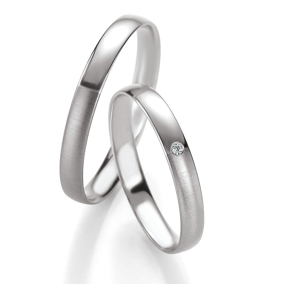 Edle Eheringe aus der Marke BREUNING, Serie Basic Light 1. Ringe aus 585 Weissgold-Graugold quermatt und poliert. 1 Brillant 0,01 ct. W/SI. Breite 3 mm. Stärke 1,3 mm.