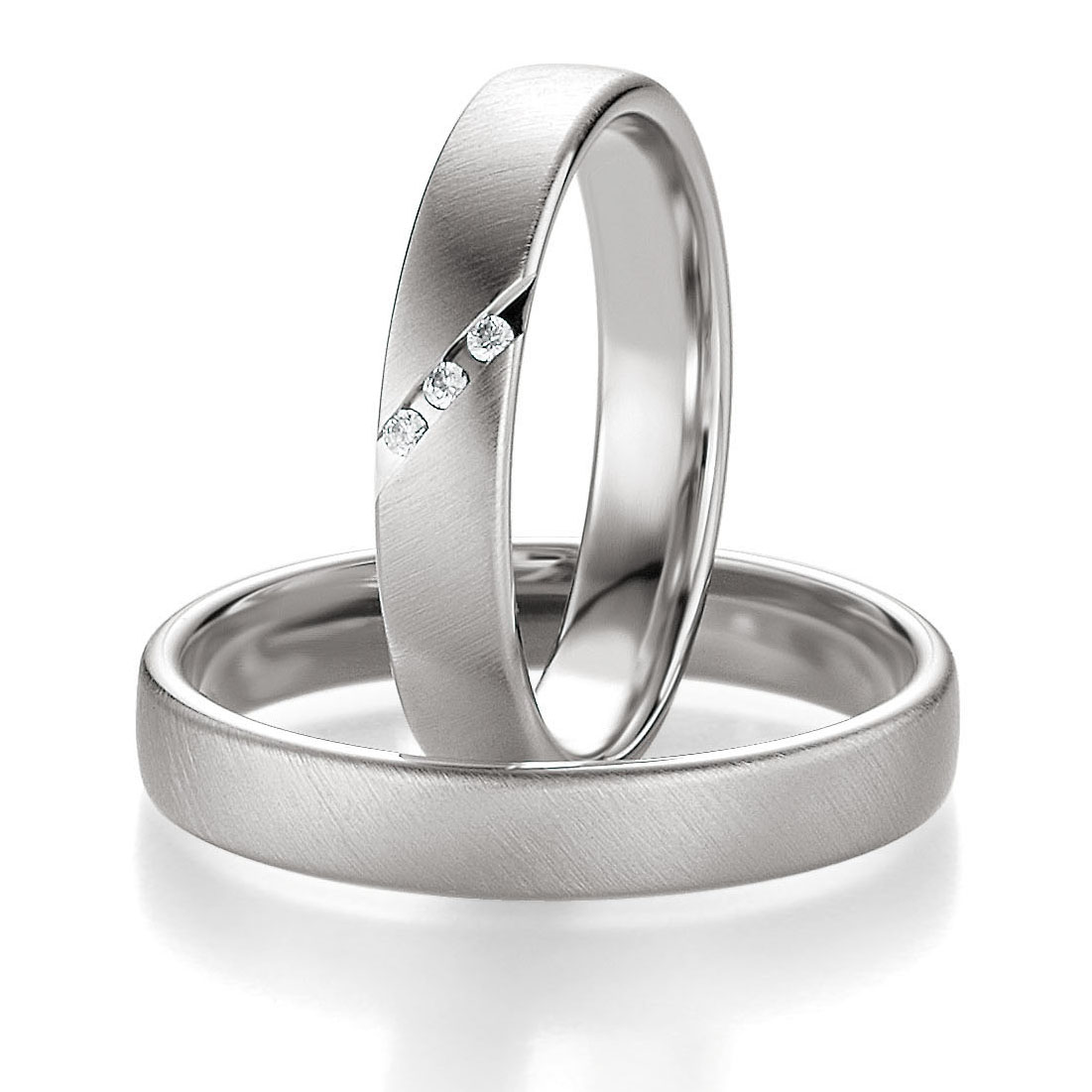 Trauringe der Marke Breuning, Serie BASIC LIGHT 2. Herrliche klassische Eheringe in 333 Weissgold quermatt. 1 Brillant 0,03 ct. W/SI. Breite 4 mm.