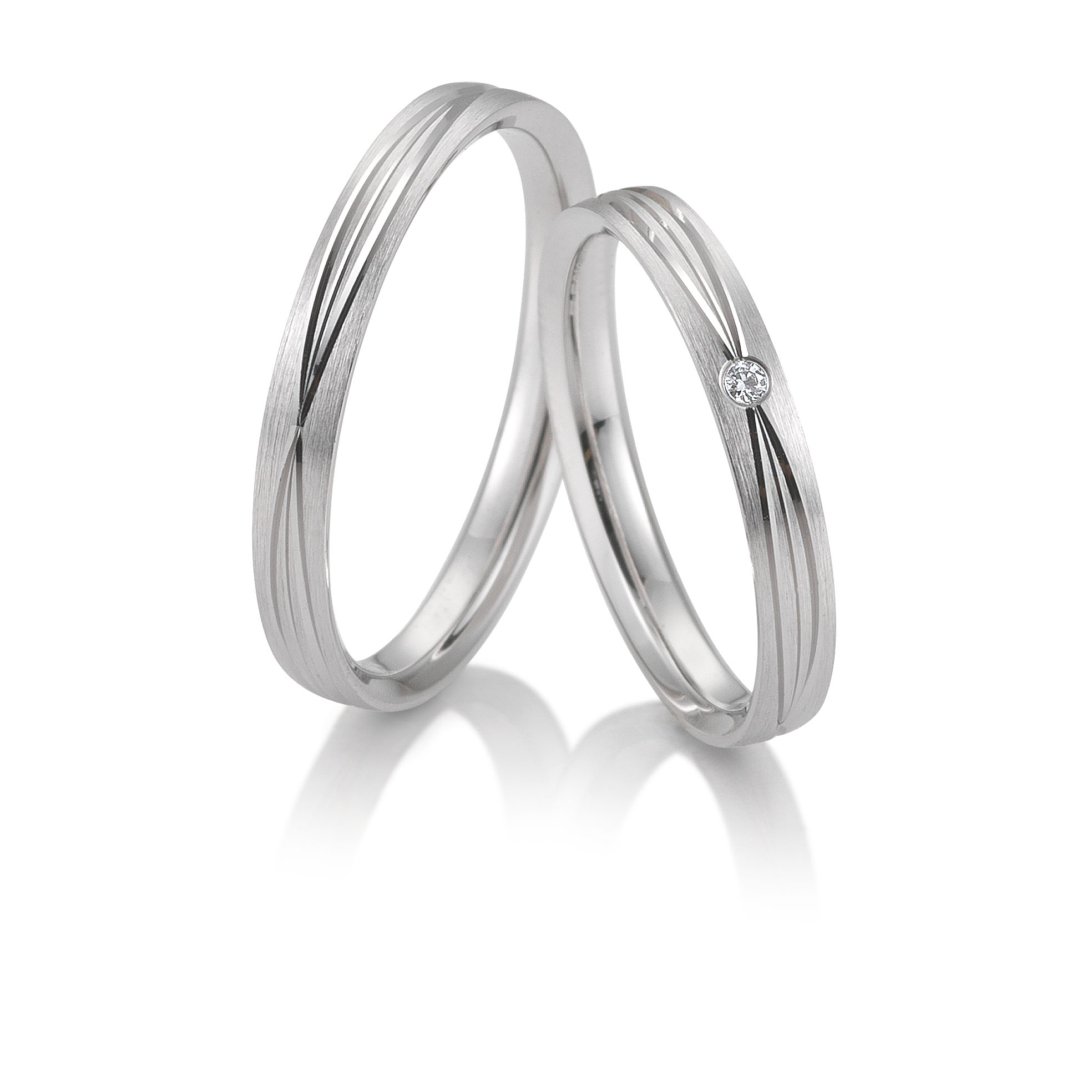 Trauringe der Marke Breuning, Serie BASIC LIGHT 3. Herrliche klassische Eheringe in 333 Weissgold seidenmatt und poliert. 1 Brillant 0,02 ct. W/SI. Breite 3 mm.