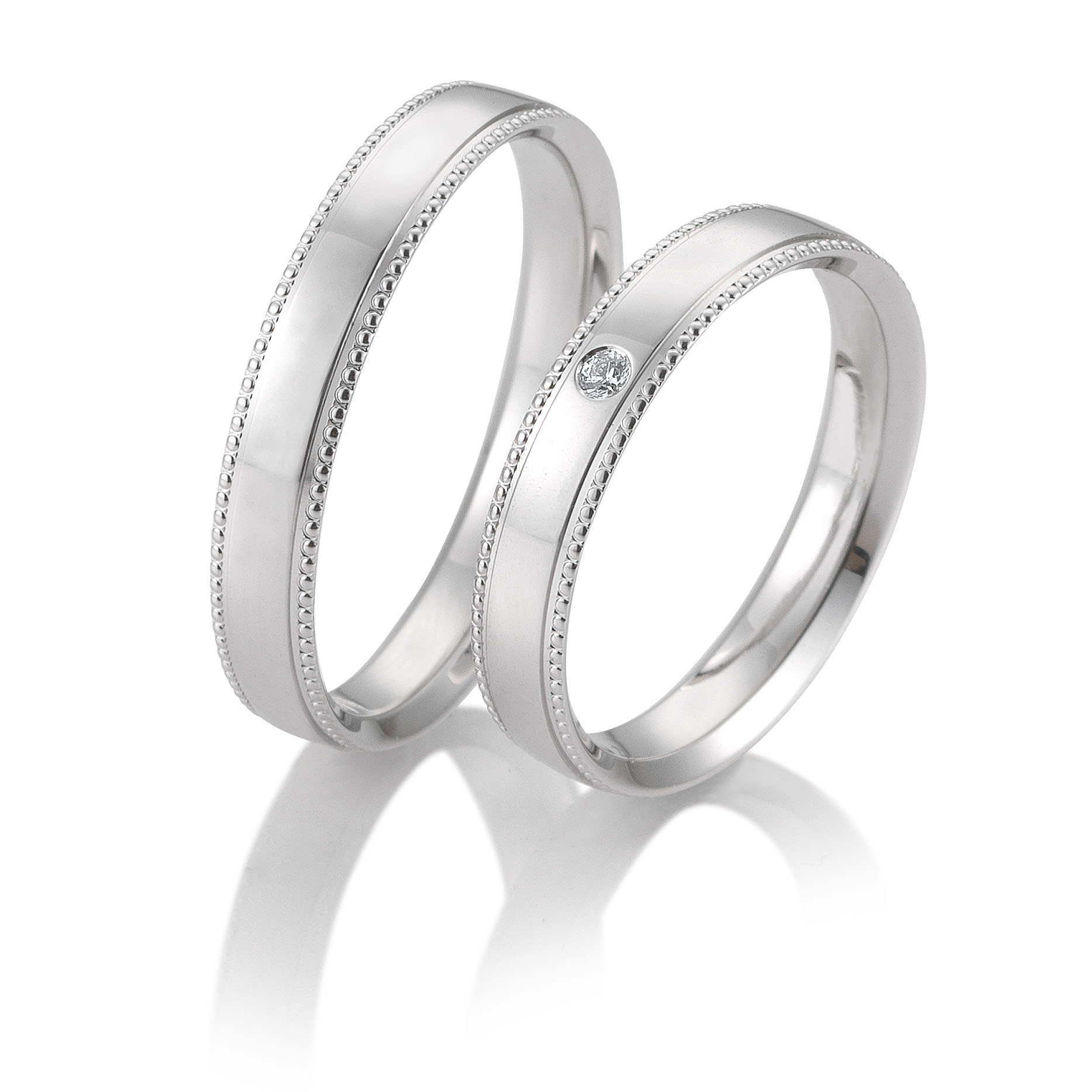 Trauringe der Marke Breuning, Serie BASIC LIGHT 3. Herrliche klassische Eheringe in 333 Weissgold gemustert poliert. 1 Brillant 0,03 ct. W/SI. Breite 4 mm.