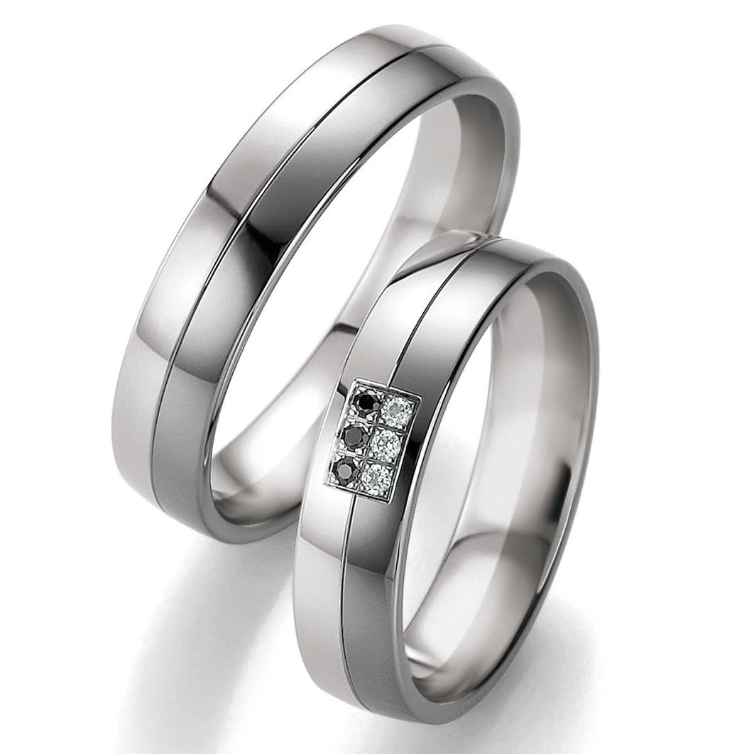 Trauringe der Marke Breuning, Serie B&W Black Diamonds. Traumhafte Trauringe in 585 Weissgold-Graugold seidenmatt, polierte Fuge. 3 schwarze/weisse Brillanten 0,06 ct. W/SI. Breite 5,00 mm.