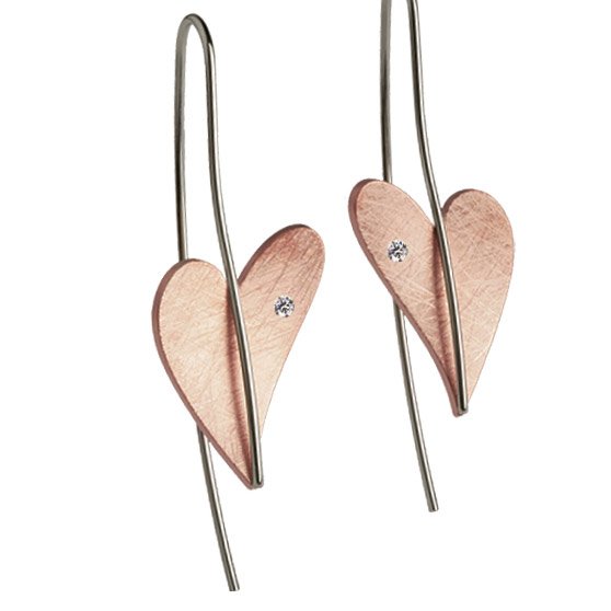 Herz Ohrhänger aus Edelstahl rot vergoldet quermatt und poliert. Größe 14x21 mm. 2 Brillanten 0,016 ct. TW/SI. Hautfreundlich un nickelfrei. Made in Germany.