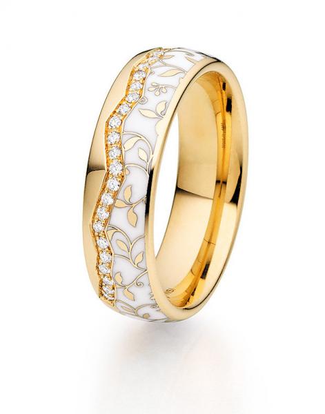 Hochwertig, elegant, atemberaubend. Das ist Elise, die neue andere Trauringkunst von Fischer - Pforzheim. 26 Brillanten zus. 0,13 ct TW-SI. Ringbreite 6,00mm. Herrenring frei wählbar.