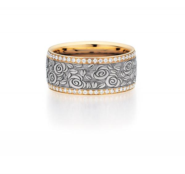 Flora-Kollektion von Fischer & Sohn aus Pforzheim since 1919. Wirklich anders. 585er Grau-Apricotgold. 102 Brillanten 0,51 ct TW-SI. Ringbreite 9,00mm. Herrenring frei wählbar.