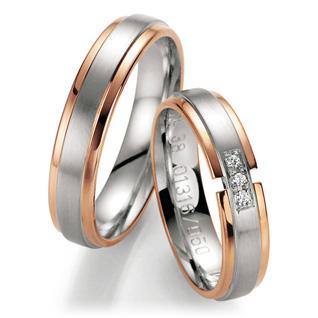 Manufaktur Fischer - Deutschland. Edle Trauringe in 585 Weissgold poliert / Rotgold seidenmatt aus der Pforzheimer Manufaktur. Eine Firma mit Tradition und gutem Preis-Leistungsverhältnis. 3 Brillanten zusammen 0,03 ct. TW/SI. Breite 5,00 mm.