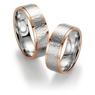 Manufaktur Fischer - Deutschland. Edle Trauringe in 585 Weissgold gehämmert - Rotgold poliert aus der Pforzheimer Manufaktur. Eine Firma mit Tradition und gutem Preis-Leistungsverhältnis. 3 Brillanten zusammen 0,03 ct. TW/SI. Breite 7,00 mm.