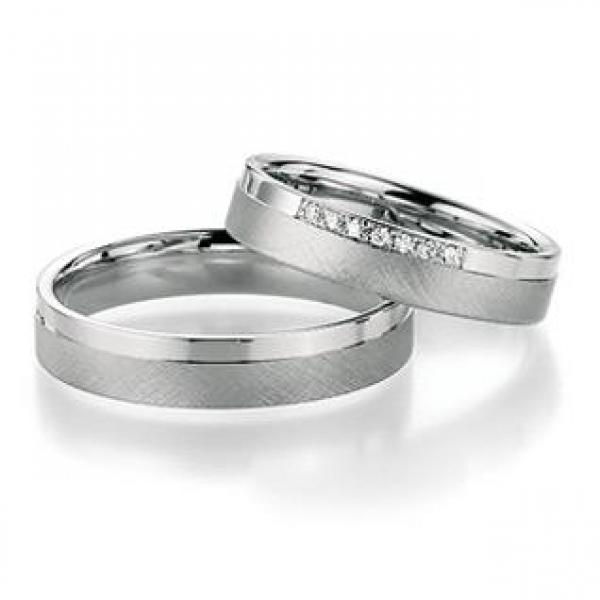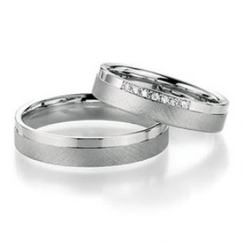 Manufaktur Fischer - Deutschland. Edle Trauringe in 585 Weissgold quernmatt und poliert aus der Pforzheimer Manufaktur. Eine Firma mit Tradition und gutem Preis-Leistungsverhältnis. 7 Brillanten zusammen 0,042 ct. TW/SI. Breite 4,50 mm.