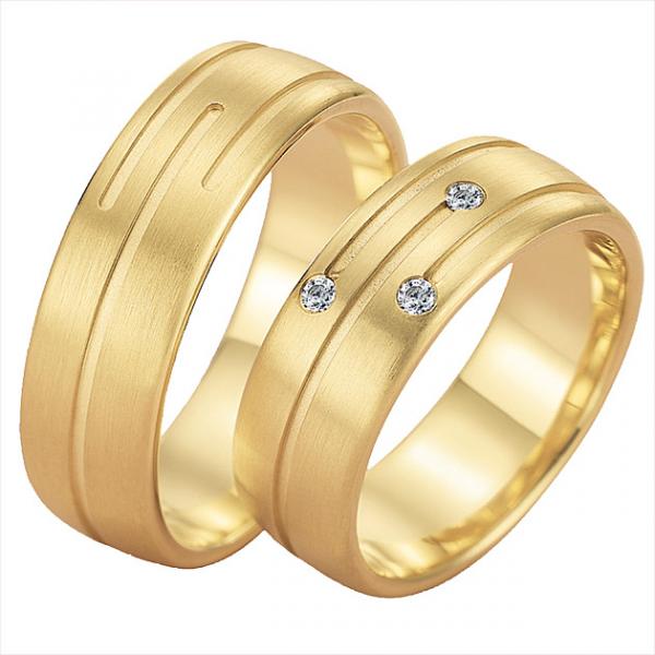 Attraktive Hochzeitsringe in 585 Gelbgold seidenmatt. 3 Brillanten zusammen 0,06 ct. TW/SI. Breite 7,00 mm. Der Trauringkomfort sehr angenehm. Sie können die Ringe auch in 375-und 750 Gelbgold erhalten. Firma Gettmann aus Deutschland in Pforzheim. Hochwertige Trauringkollektion, was zu Ihrer Hochzeit dazu beitragen kann.