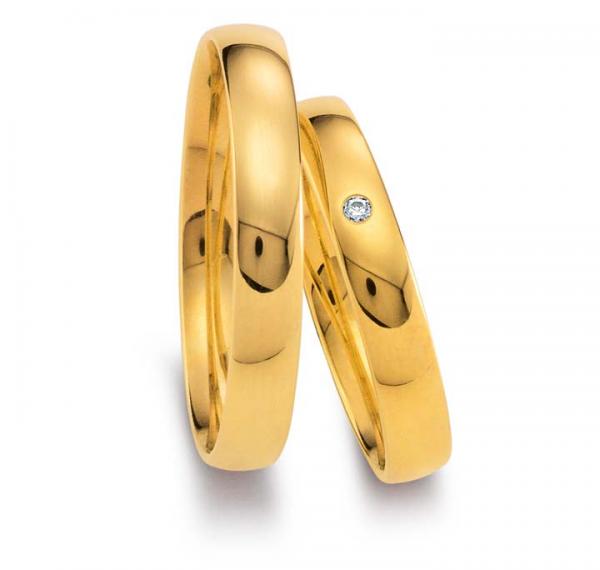 Klassiche Trauringe in 375 Gelbgold poliert oder matt. 1 Brillant 0,015 ct. TW/SI. Breite 3,50 mm. Bestellung in Weissgold und Palladium auf Anfrage möglich!