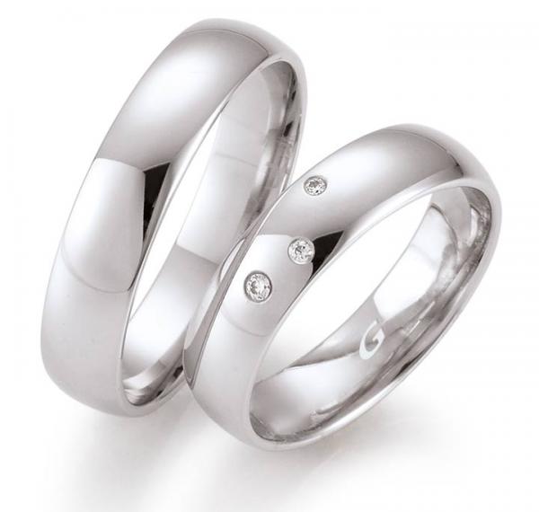 Unrhodiniertes Weissgold, welches farbtreu und grau ist. Firma Gettmann aus Deutschland in Pforzheim. Hochwertige Trauringkollektion, was zu Ihrer Hochzeit dazu beitragen kann. Edle Trauringe in 375 Graugold poliert. 3 liebevolle Brillanten 0,025 ct. TW/SI. Breite 5,00 mm.