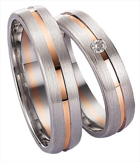 Firma Gettmann aus Deutschland in Pforzheim. Hochwertige Trauringkollektion, was zu Ihrer Hochzeit dazu beitragen kann. Edle Trauringe in 585 Graugold seidenmatt / Rotgold poliert. 1 Brillant 0,04 ct. TW/SI. Breite 5,00 mm.