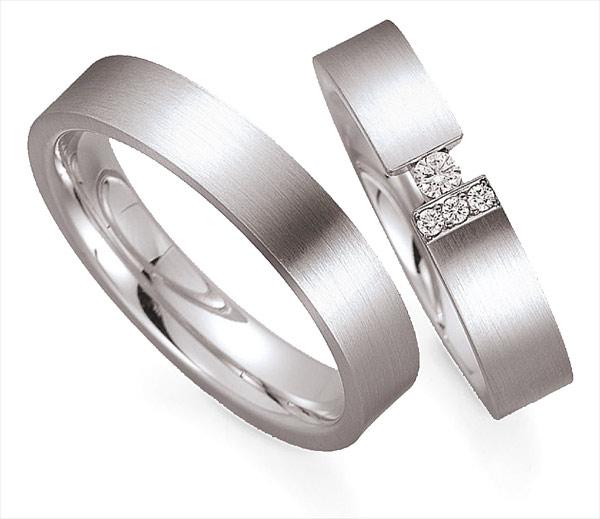 Ein charmantes Trauringpaar in 585 Weissgold seidenmatt. 4 Brillanten zusammen 0,08 ct. TW/VSI. Breite 4,50 mm. Firma Gettmann aus Deutschland in Pforzheim. Hochwertige Trauringkollektion, was zu Ihrer Hochzeit dazu beitragen kann. Wählen Sie eine gelungene Gravur aus.