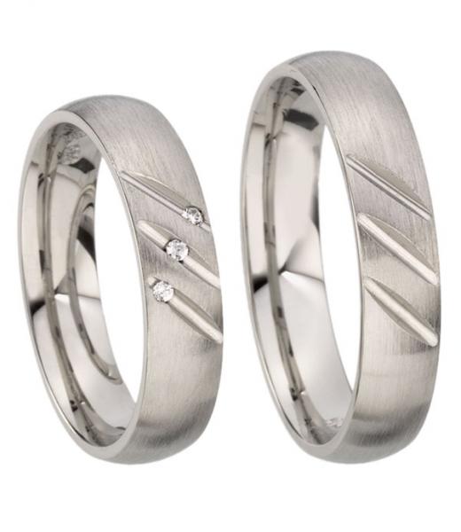 Manufaktur Kühnel - Deutschland. LIEBE ist Kühnel. Edle Trauringe in 585 Weißgold seidenmatt und poliert. Trauringe mit gutem Tragekomfort und attraktiven Preis. 3 Brillanten zusammen 0,03 ct. W/SI. Breite 5,00 mm.