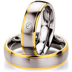 Lebhafte Partnerringe aus Edelstahl-Gold. Bei dem "Gong" sagt SIE: Schatz, der ist es; diese Ringe spenden einem Freude. Der Damenring mit funkeldem Brillantbesatz. Die Größen erhältlich von 45-75. Manufaktur Nowotny - Österreich. Partnerringe aus Edelstahl seidenmatt in Kombination mit 585 Gelbold poliert. 1 Brillant 0,03 ct. W/SI. Breite 6,00 mm.