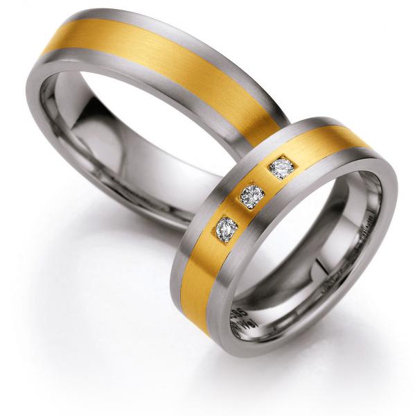 Hier bieten wir mit viel Liebe zur Kunst fantastische Partnerringe aus Edelstahl-Gold an aus der Serie White-Style an. Die Ringe sind in Größen 45-75 erhältlich und inklusive Gravur. Manufaktur Nowotny - Österreich. Partnerringe in Edelstahl seidenmatt in Kombination mit 585 Gelbgold. 3 Brillanten zusammen 0,111 ct. W/SI. Breite 6,00 mm.