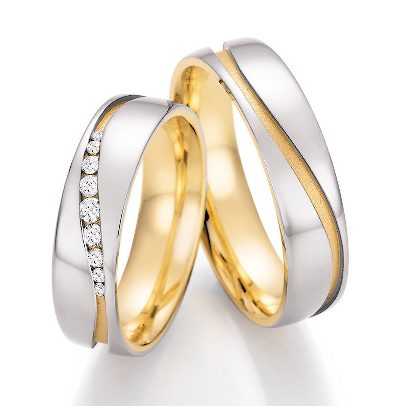 Tolle, farbige Trauringe in 585er Weiß-Gelbgold mit vielen Brillanten 0,157 ct W-SI. Ringbreite 5,50mm. Manufaktur Nowotny. Einer der größten Hersteller aus Österreich since 1881.