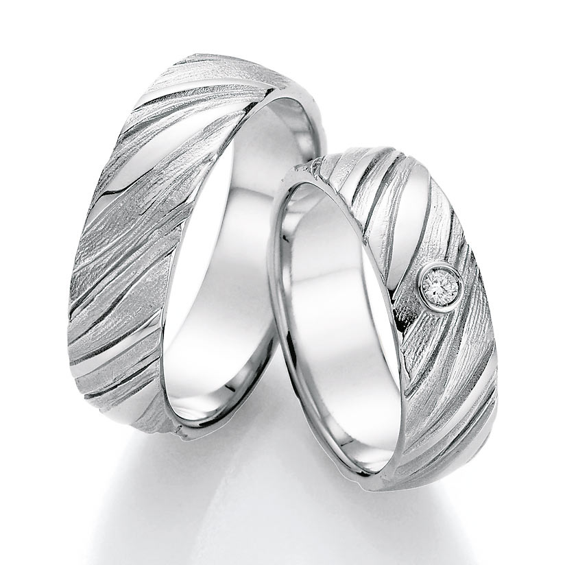 Kollektion Fascination of art der Firma Nowotny aus Österreich. Gelungene Trauringe mit schönen zisilierten Fugen in 585 Weissgold poliert und teilmatt für den schönsten Moment im Leben. 1 Brillant 0,04 ct. W/SI. Breite 6,1 mm.