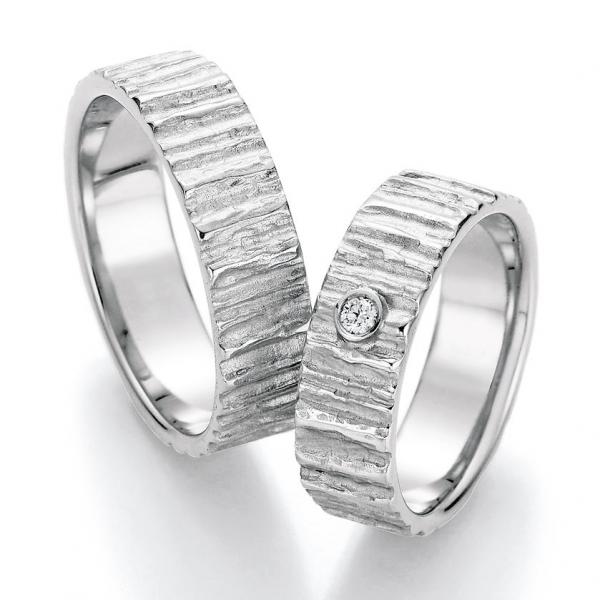 Kollektion Fascination of art der Firma Nowotny aus Österreich. Gelungene Trauringe mit schönen zisilierten Fugen in 585 Weissgold gehämmert matt für den schönsten Moment im Leben. 1 Brillant 0,04 ct. W/SI. Breite 6,0 mm.